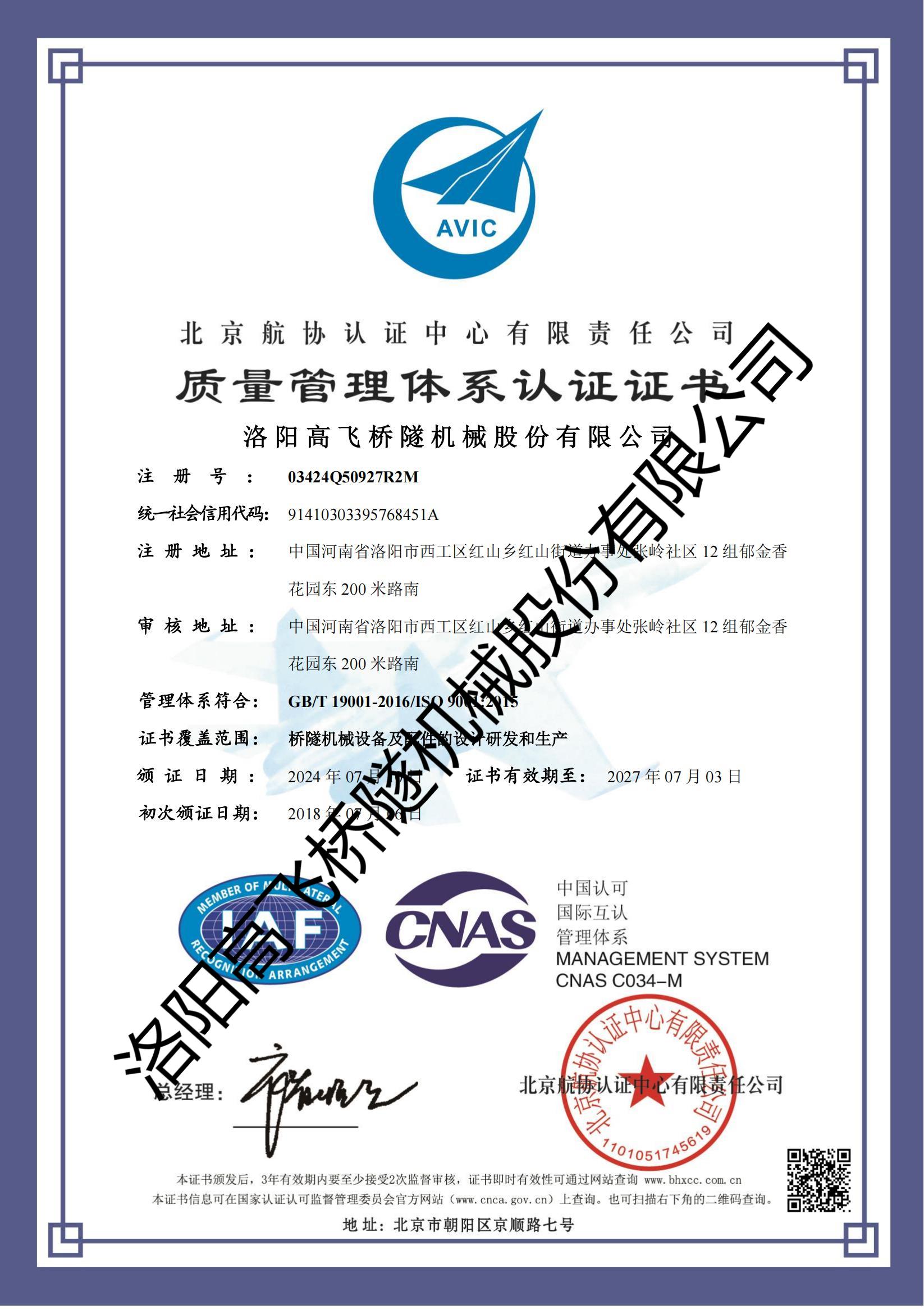 北京航協質量管理體系認證證書